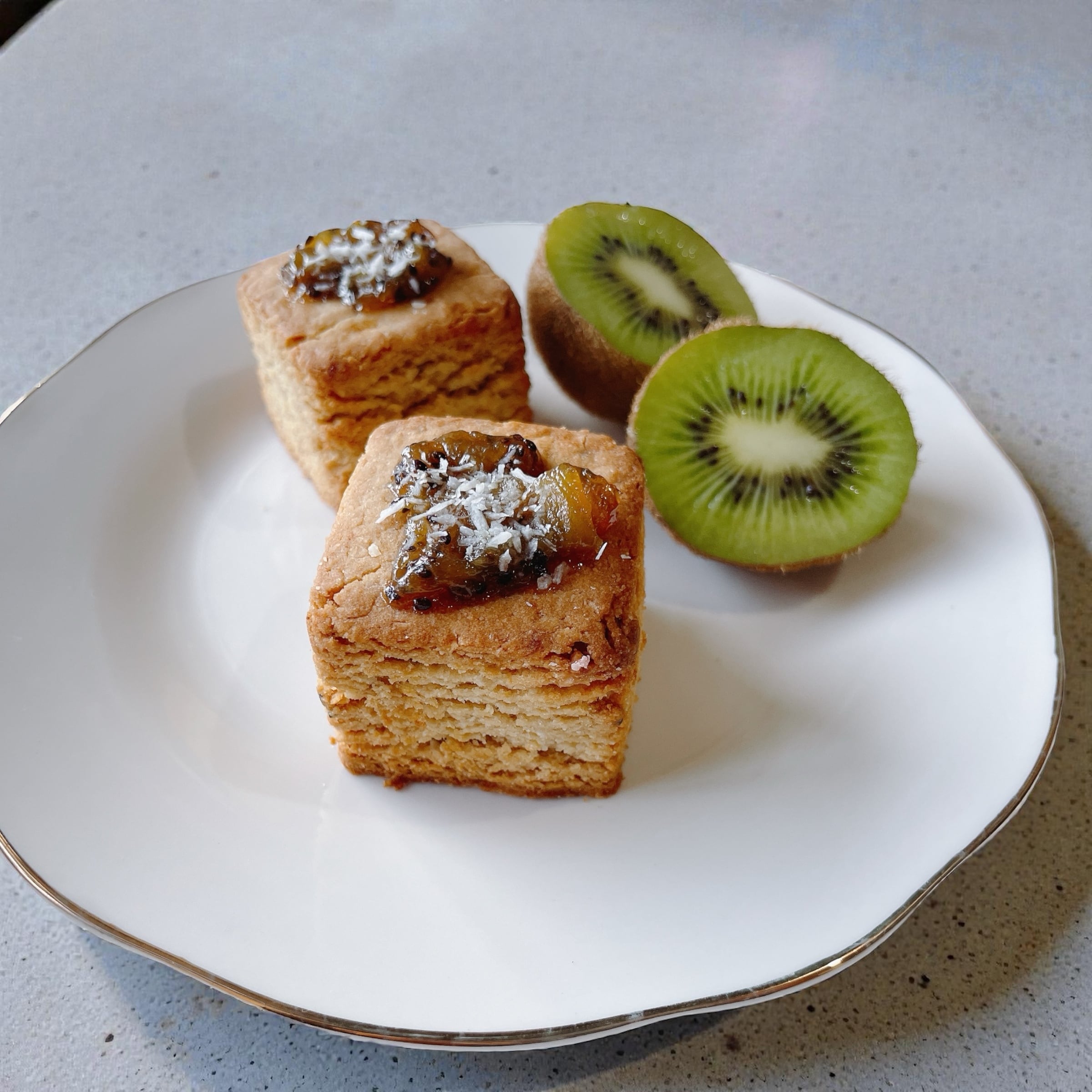 自家製キウイのジャムとココナッツを混ぜ込んで焼き上げたトロピカルな風味のスコーン.