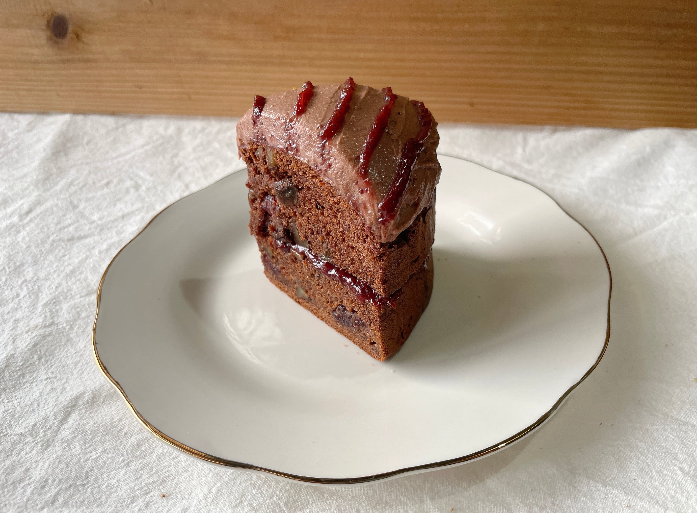 スパイス生地に、チョコレートとココアを加えた濃厚な味わいのショコラケーキ.アニス香る自家製いちごソースとショコラフロスティングをトッピング.