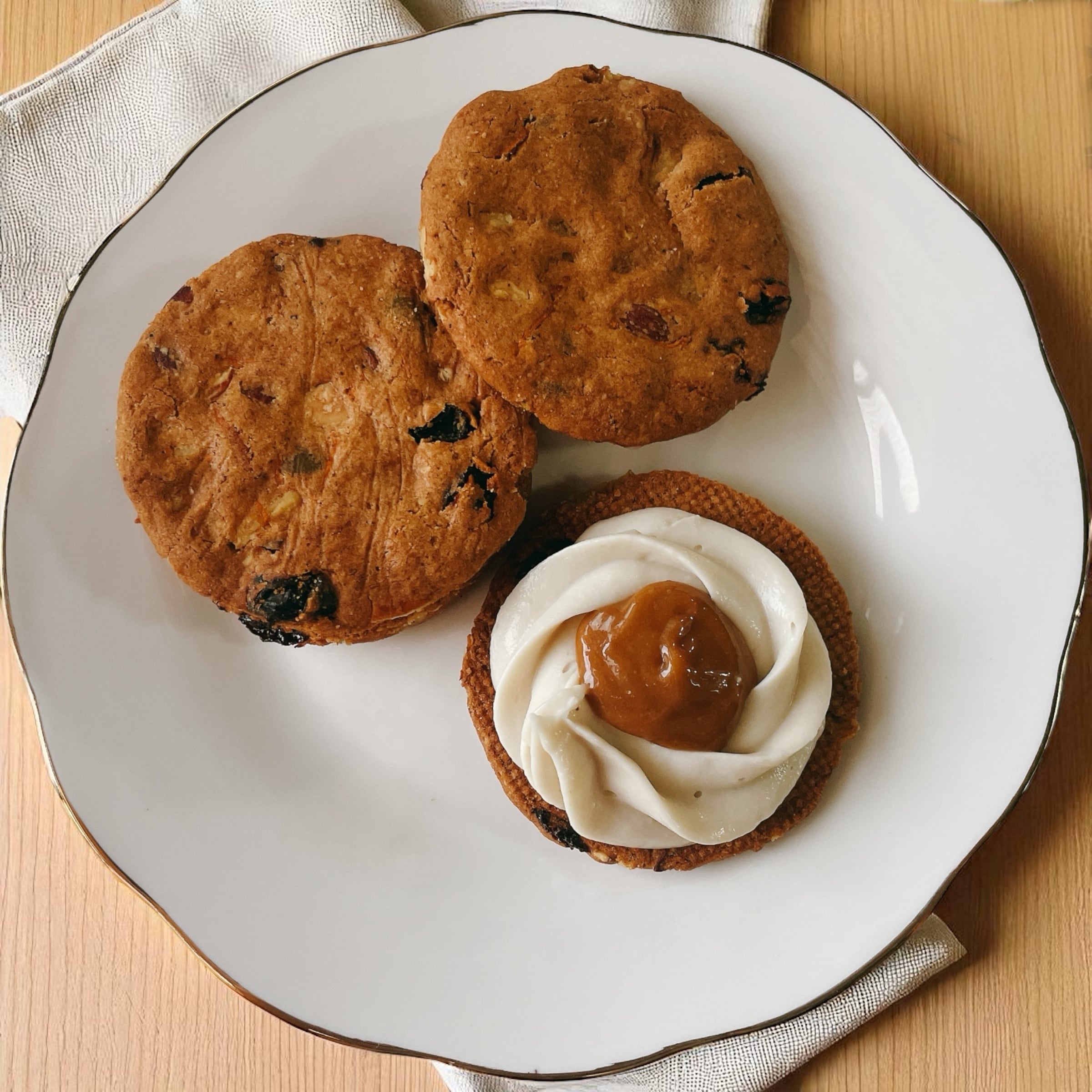人参とスパイス、レーズンやクルミなど混ぜ込んで焼き上げたザクザク食感のクッキーに、キャラメリゼした落花生のクリーム、濃厚チーズクリームをサンド.